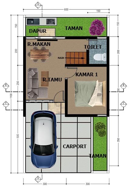 2 Kamar Tidur, Ruang Tamu, Dapur, Carport, Taman